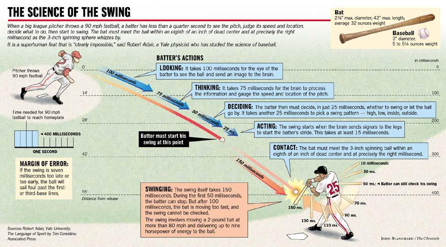 Illus: A stellar Yale Physicist Robert Adair studied the science of baseball with many experiments and articles. Essentially, he determined when a MLB pitcher throws 90mph fastball it takes 400 milliseconds to reach home plate; yet the batter requires at least 450 milliseconds to swing at more than 80mph, and meet the 3” spinning ball with 1/8” dead center of the ball and at precisely the right millisecond for it to at least be a fair ball. He concludes, “Hitting a baseball is a superhuman feat that is clearly impossible.”